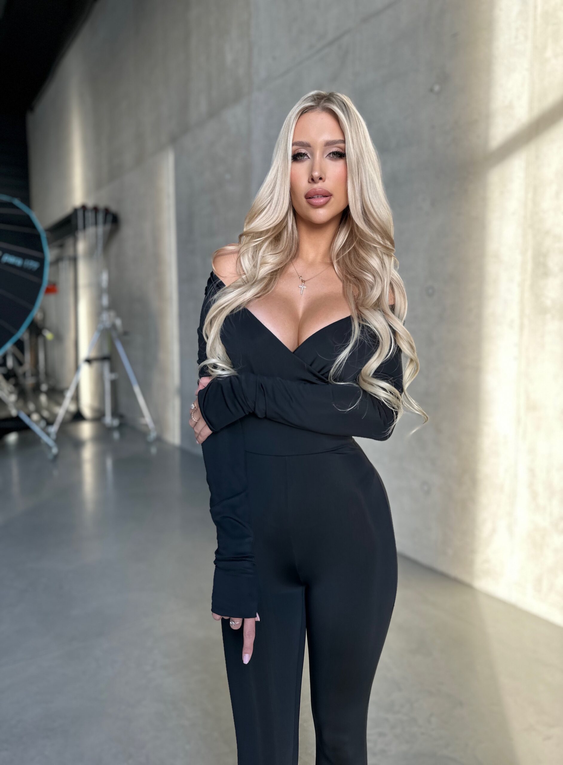 Czarny kombinezon uszyty z matowej lycry to uniwersalny strój, który oferuje dwie różne stylistyczne możliwości noszenia. Dzięki elastyczności materiału i konstrukcji, ramiona kombinezonu mogą być opuszczone dla bardziej efektownego i seksownego wyglądu, eksponując delikatnie odkryte ramiona oraz dając subtelną nutę zmysłowości. Z drugiej strony, pozostawienie ramion w oryginalnej pozycji tworzy klasyczny i elegancki wygląd, zachowując równowagę między szykownością a wygodą. To wszechstronny strój, który umożliwia eksperymentowanie z stylem, podkreślając zarówno kobiecą zmysłowość, jak i klasyczny urok czarnego kombinezonu.