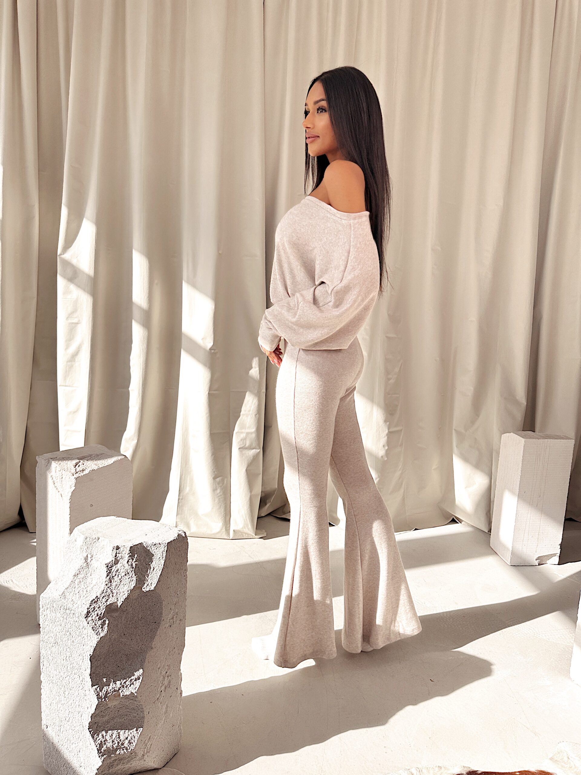Dopełnieniem zestawu są długie, rozkloszowane spodnie z szeroką, elastyczną gumą w pasie, które zapewniają wygodę i pięknie podkreślają talię. Ich lejący materiał i dopracowany fason sprawiają, że nogi wydają się dłuższe i smuklejsze.